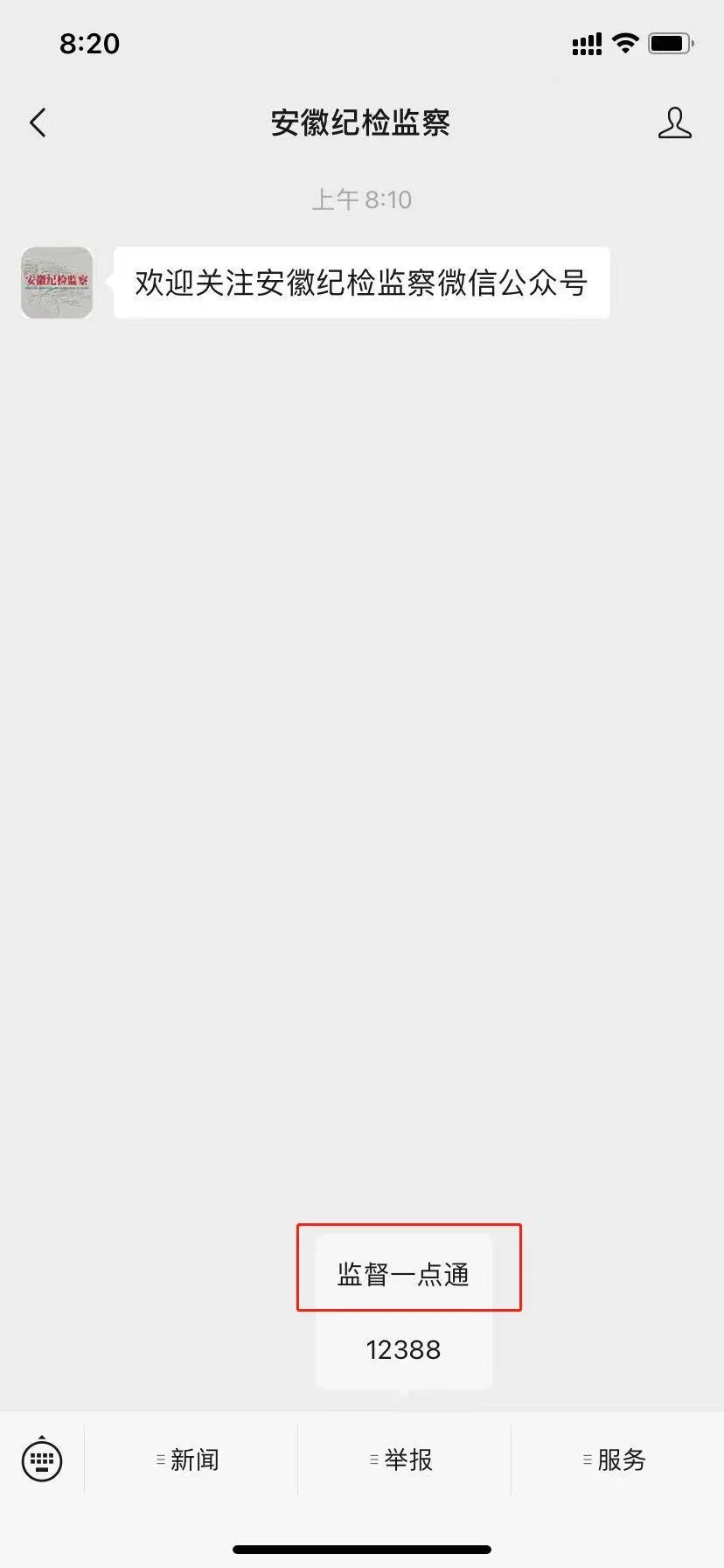 2、進入下方“安徽紀檢監察 ”微信公眾號菜單欄,點擊“舉報”,選擇“監督一點通”進入服務平臺。