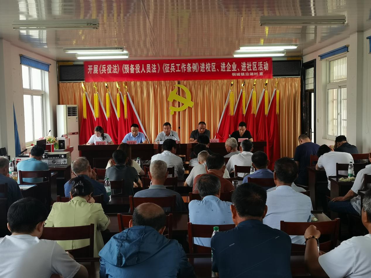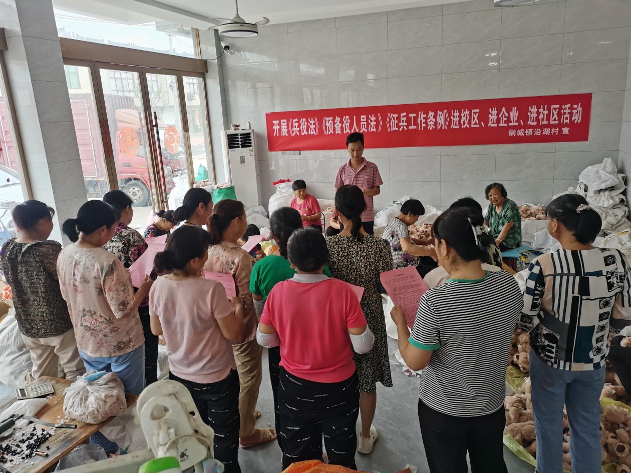 2024年7月22日,銅城鎮沿湖村召開村民代表大會集中宣傳《中華人民共和國兵役法》《中華人民共和國預備役人員法》《征兵工作條例》等兵役政策法規,切實加大宣傳力度,做到精準宣傳、全方位宣傳。會后,組織人員到本村毛絨玩具加工廠、木材加工廠、機械加工廠等企業開展宣傳活動。