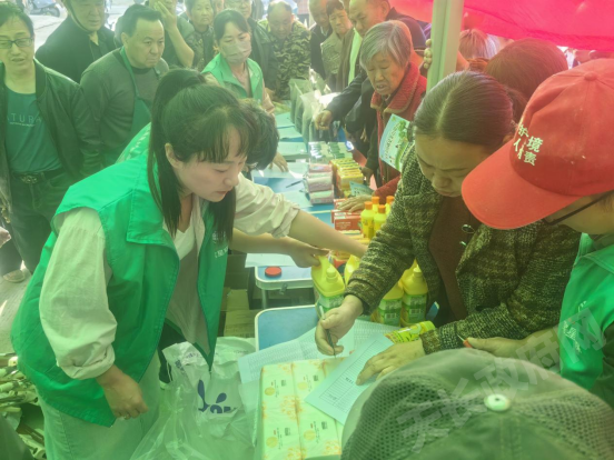 活動現場積分兌換點商品琳瑯滿目,抽紙、垃圾袋、洗潔精、香皂、大米等生活用品擺放整齊。按照兌換原則,積分越高,兌換的獎品越豐厚。活動正式開始后,村民有序查詢前期自家廚余垃圾稱重獲得的積分,按照積分多少兌換相應獎品。趁著積分集中兌換的契機,工作人員通過現場宣講、發放宣傳手冊等形式,向附近村民再次宣傳廚余垃圾分類知識,加深村民對廚余垃圾的認識,鼓勵村民爭做廚余垃圾源頭減量的踐行者、垃圾分類的宣傳員和垃圾分類回收利用的推動者。
